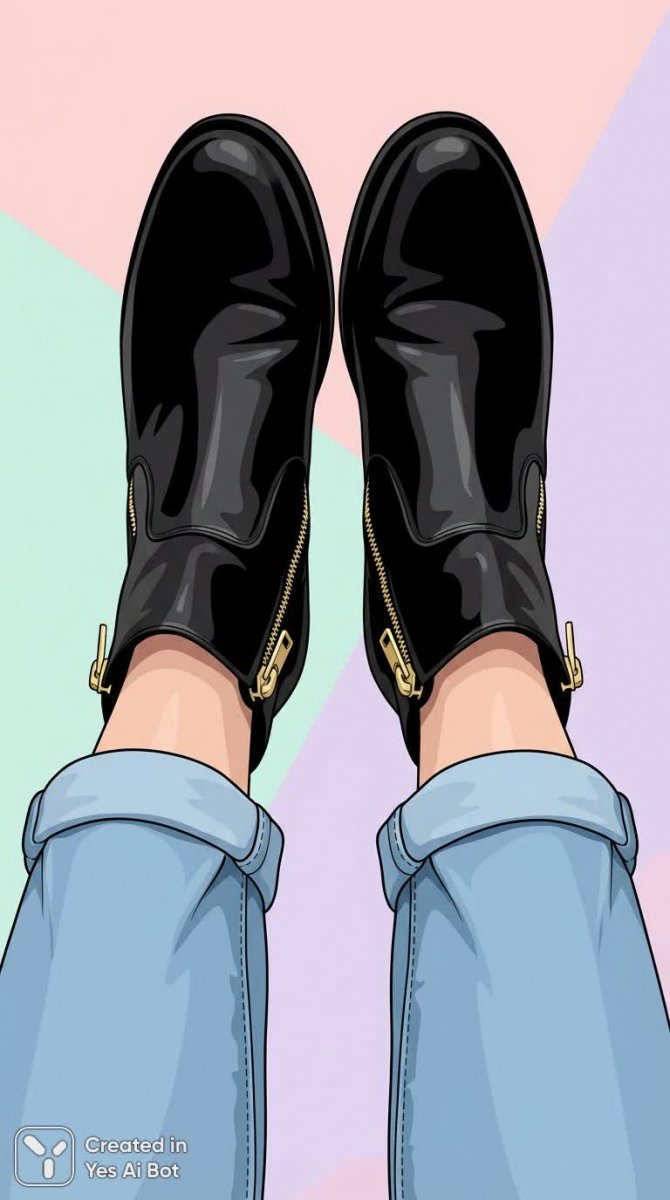 1. female legs in light blue jeans, black ankle boots with gold zippers, view from above, minimalist pastel background, vector style illustration, focus on shoes and ankles.