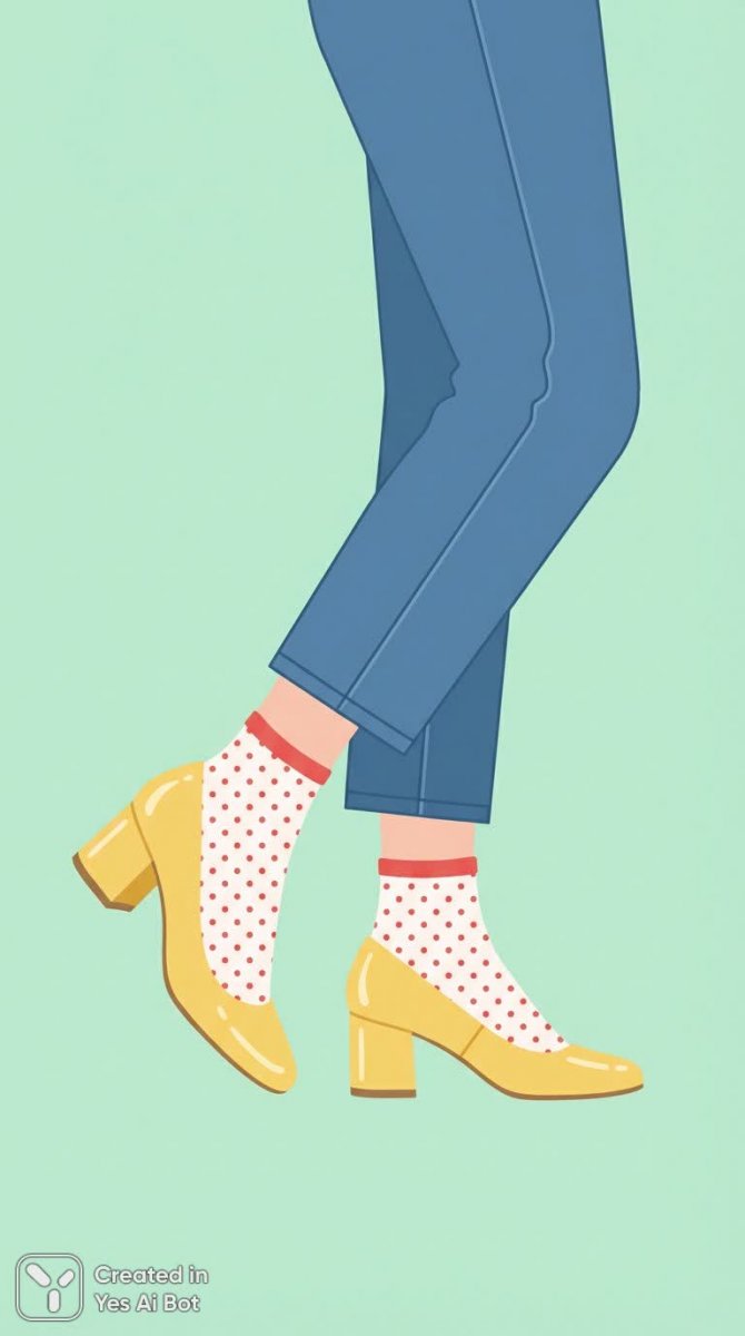 female legs in cropped blue jeans, yellow patent leather block heels, polka dot socks, minimalist style, solid pastel background, illustration, clean lines, playful colors.