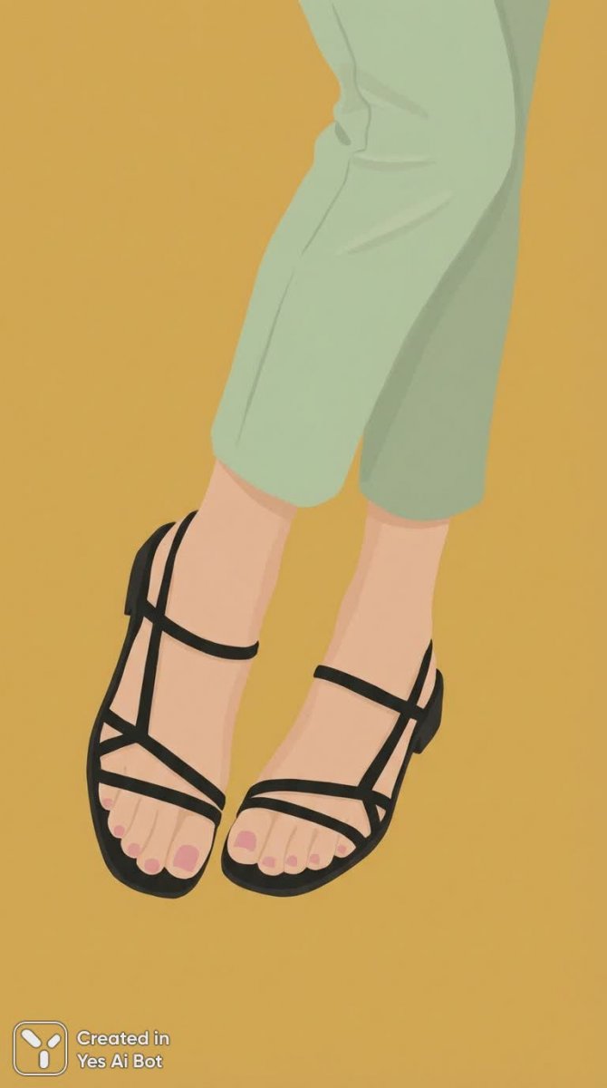 female legs in light green pants, strappy black sandals, pink nail polish on toes, soft lighting, simple illustration style, solid warm tone BG, trendy look.