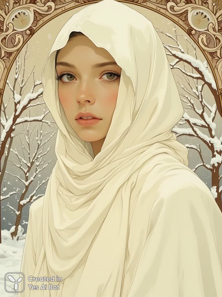 The vertical composition in the Art Nouveau style depicts a young woman of European descent standing against a winter landscape. In her twenties, she is wrapped in a long, flowing pale ivory cloak. Her head is covered with a hood of the same color, which frames her face, revealing her graceful profile. Her facial expression conveys a sense of calm introspection, perhaps with a hint of melancholy. The background features branches covered with snow, and a stylized ornamental frame surrounds the image. The branches are painted in soft brown and beige tones, contrasting with the pure white snow. The lighting is soft and diffused, creating a muted...