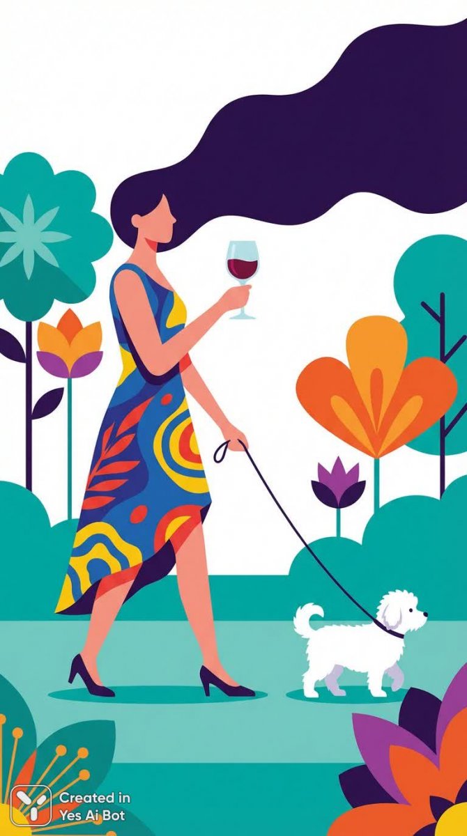 Изображение демонстрирует стильную девушку с длинными волосами, уверенно идущую в асимметричном наряде, держа в руке бокал красного вина. Рядом с ней – пушистая собака, добавляющая образу легкости. Работа выполнена в минималистичной векторной технике с использованием плоских форм и ярких цветов, дополненных геометрическими узорами и цветочными мотивами. Композиция создает впечатление современности, элегантности и гармонии, излучая позитив и вдохновляя на самовыражение. Иллюстрация подходит для использования в различных дизайнерских проектах, подчеркивая индивидуальность и уверенность в себе, создана нейросетью Nano Banana v.1.0 Pro по запросу, стилизация отсутствует.