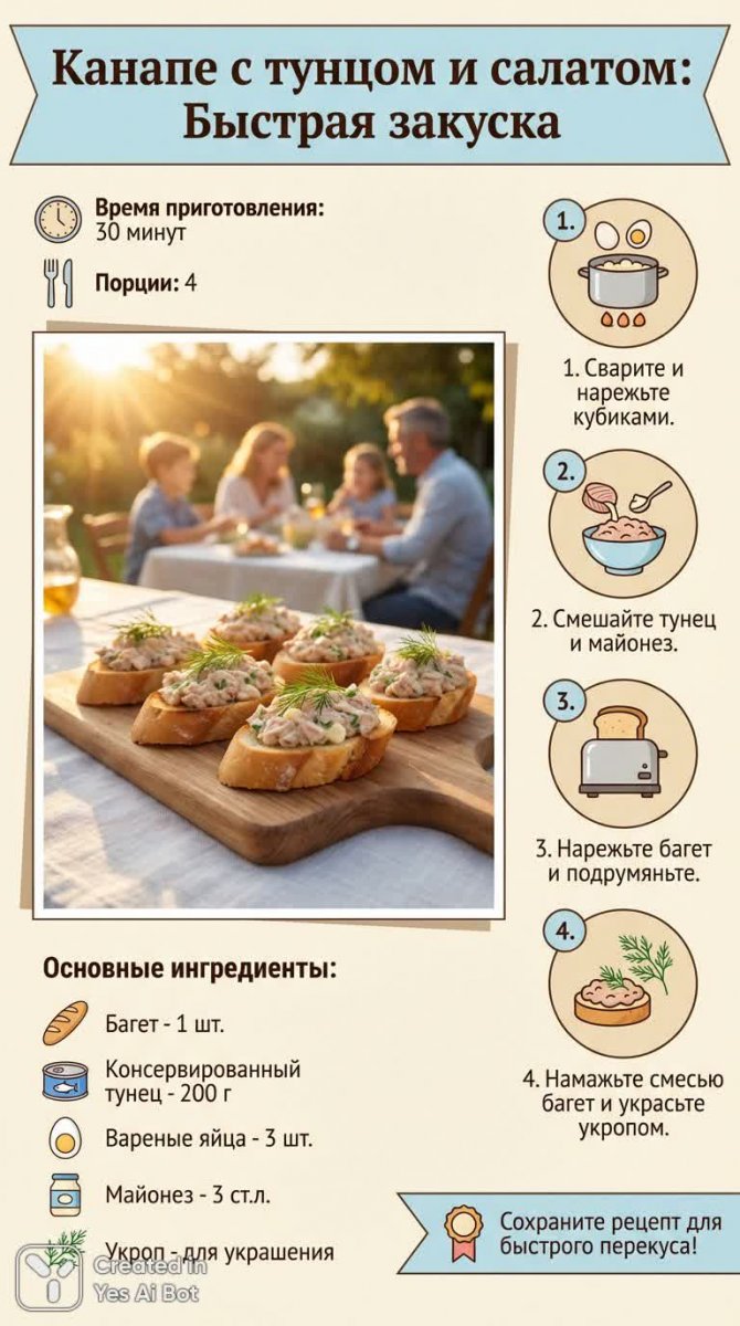 Изысканные канапе с тунцом и нежным яичным салатом – идеальное решение для легкого перекуса или элегантной закуски на праздничном столе. Этот простой в приготовлении рецепт займет всего 30 минут вашего времени, а результат порадует вас своим ярким вкусом и аппетитным видом. В основе этого кулинарного шедевра – хрустящие кусочки багета, щедро намазанные ароматной начинкой из консервированного тунца, нежных вареных яиц и классического майонеза. Свежий укроп добавляет канапе свежести и яркости, делая их настоящим украшением любого застолья. Этот рецепт идеально подходит для тех, кто ценит скорость и простоту приготовления без ущерба для вкуса и качества. Канапе с тунцом – это отличный способ удивить своих гостей или порадовать себя и близких вкусным и полезным перекусом. Не упустите возможность добавить этот легкий и аппетитный рецепт в свою кулинарную книгу! Насладитесь ярким сочетанием вкусов и ароматов, которые подарит вам это простое, но невероятно вкусное блюдо. Приготовьте канапе с тунцом прямо сейчас и убедитесь сами, насколько легко и быстро можно создать настоящий кулинарный шедевр!