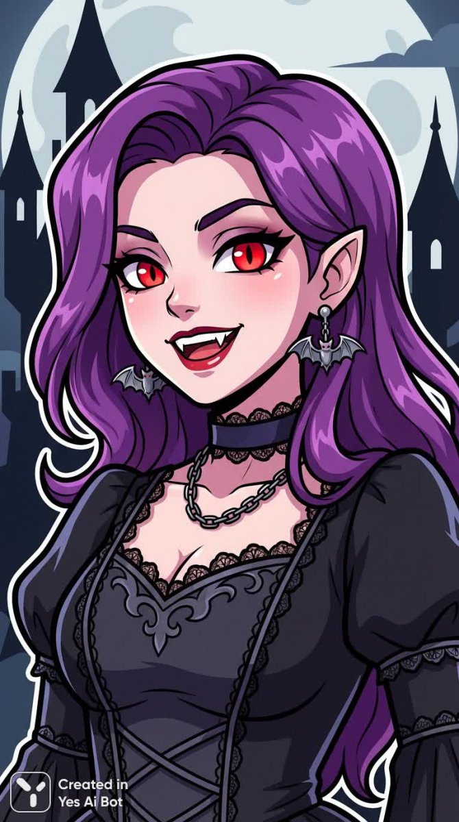 Изображение демонстрирует аниме-стилизованную девушку вампир, выполненное нейросетью Nano Banana v.1.0 Pro. Персонаж представлен в эффектном черном платье с детализированными аксессуарами, что подчеркивает ее уверенность и соблазнительность. У нее короткие фиолетовые волосы и пронзительные алые глаза, добавляющие образу хищности и загадочности. Острые клыки и самодовольная улыбка намекают на скрытую силу и опасность. Цифровое искусство отличается четкими контурами и яркой визуальной композицией, передающей энергию и харизму персонажа. Созданный образ сочетает в себе элегантность, темную привлекательность, нежность и смертоносность, являясь примером выразительной аниме-стилистики с акцентом на детали и эмоции. Динамичная поза и уверенный взгляд делают девушку живой героиней аниме-вселенной, идеальным выбором для ценителей красоты в сочетании с мрачностью и загадкой. Изображение создано по запросу (промту), включающему описание персонажа: мультяшная аниме-девушка, потрясающая вампирша с короткими фиолетовыми волосами и острыми клыками, уверенная улыбка, привлекательное черное платье, детализированные аксессуары, пронзительные красные глаза, цифровое искусство в стиле аниме, смелые контуры.