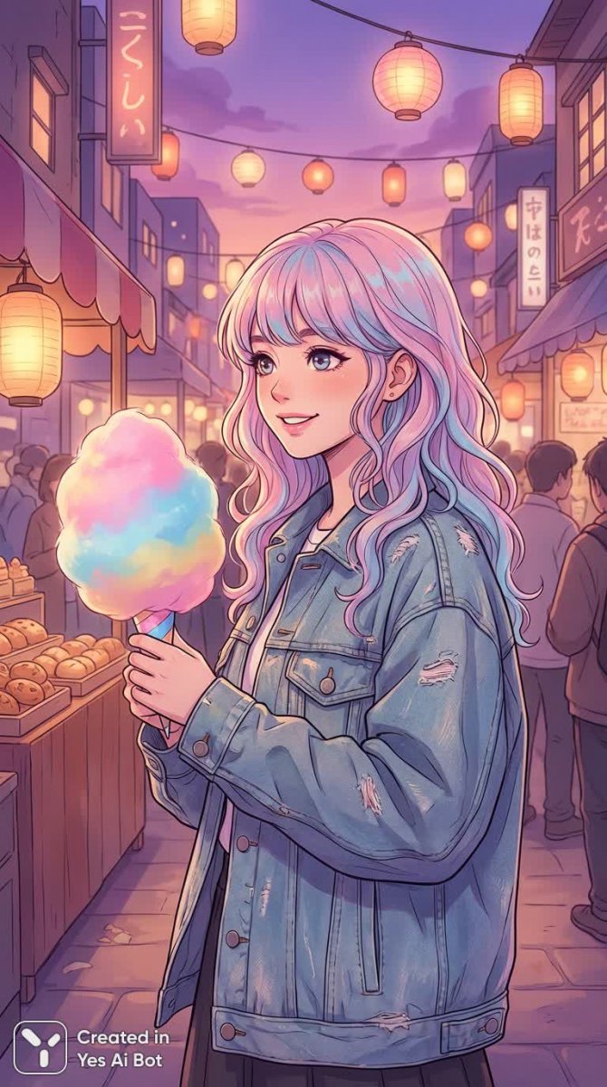 5. cartoon anime girl with pastel hair, wearing oversized denim jacket, holding colorful cotton candy; BG: vibrant street market with cozy twilight setting; smooth gradients, high detail, playful atmosphere.