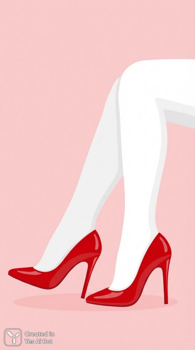 Изящные женские ноги в белых кружевных чулках и ярких алых лаковых туфлях на высоком каблуке представлены в боковом виде. Фон выполнен в нежно-розовых тонах и отличается минимализмом, создавая ощущение легкости и воздушности. Стиль иллюстрации – плоский, без лишних деталей, что подчеркивает элегантность и чистоту композиции. Мягкое освещение добавляет образу мягкости и утонченности, акцентируя внимание на деталях кроя чулок и блеске лаковой кожи обуви. Общий визуальный эффект – это изысканная и современная иллюстрация, посвященная женской красоте и стилю. Акцент сделан на гармоничном сочетании цветов и форм, создавая эстетически приятное впечатление. Изображение идеально подойдет для использования в модных журналах, рекламных материалах или как часть графического дизайна. Оно воплощает собой современную элегантность и минималистичный подход к изображению женской фигуры