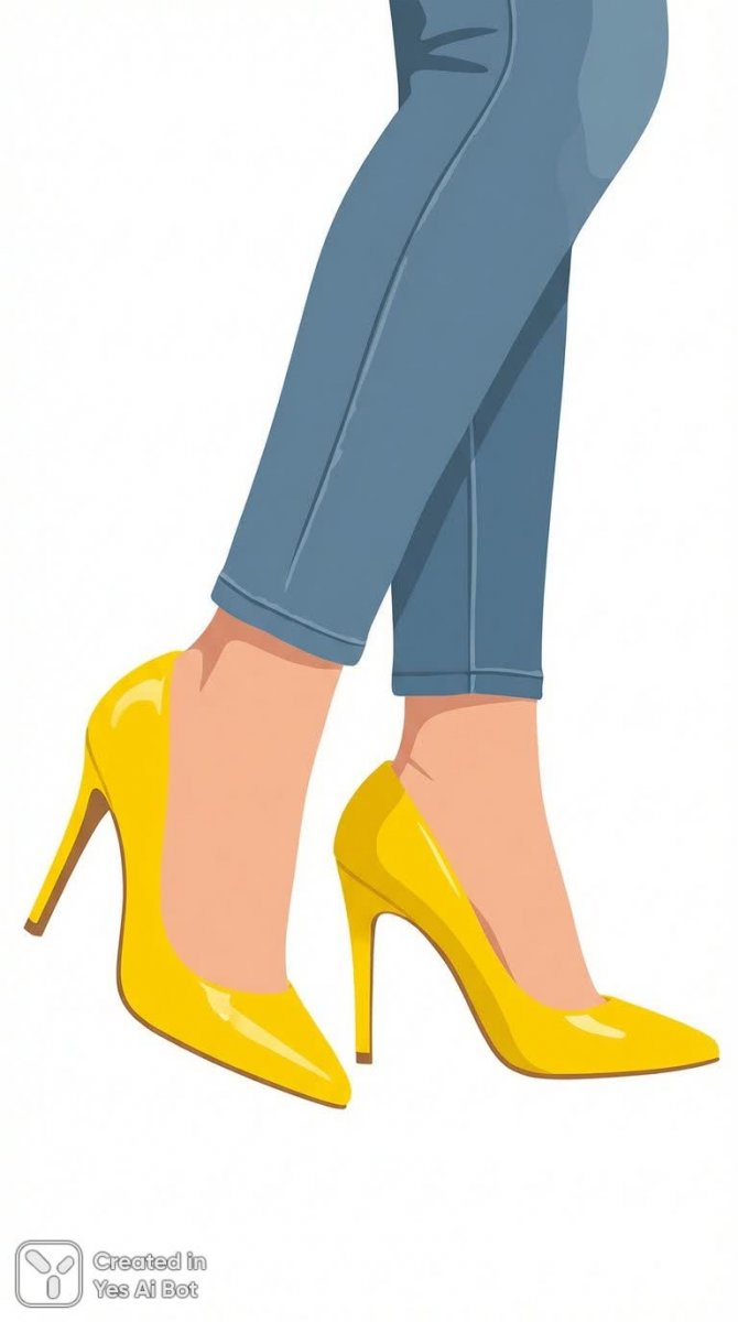 На изображении, созданном нейросетью, показаны загорелые ноги в рваных синих джинсах, на которых красуются яркие желтые лаковые туфли-лодочки на шпильке. Фон однотонный, белый, что позволяет сконцентрироваться на деталях обуви и гармоничном сочетании цветов. Композиция минималистична, подчеркивая динамику и уверенность благодаря контрасту между джинсовой тканью и блеском лаковой кожи. Акцент сделан на стильных туфлях, которые выступают в роли центрального элемента благодаря необычной расцветке и изящной форме. Светотень выгодно подчёркивает текстуру материала, создавая ощущение объёма и реалистичности, что делает работу гимном летней моды и дерзкому стилю. Картина излучает энергию и позитив, вдохновляя на эксперименты с цветом и стилем, демонстрируя элегантность образа, где каждая деталь играет важную роль. Иллюстрация выполнена в стиле минимализма без использования каких-либо дополнительных стилистических приёмов нейросетью Nano Banana v.1.0 Pro.