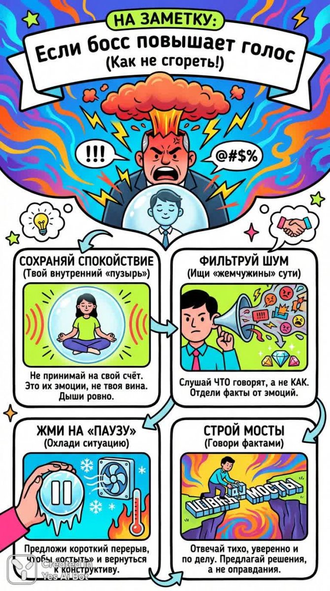 Как справиться с криком начальника: инфографика с полезными советами и ярким дизайном - Изображение, созданное нейросетью Нано Банана