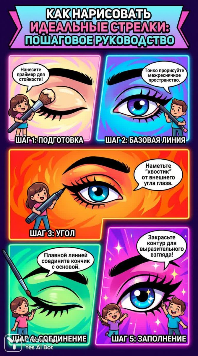 4. продемонстрируйте инфографику на русском языке с пошаговым руководством по рисованию стрелок на глазах, миниатюрные персонажи показывают процесс, яркие акценты, смелое оформление, выразительные глаза, живые цвета.
