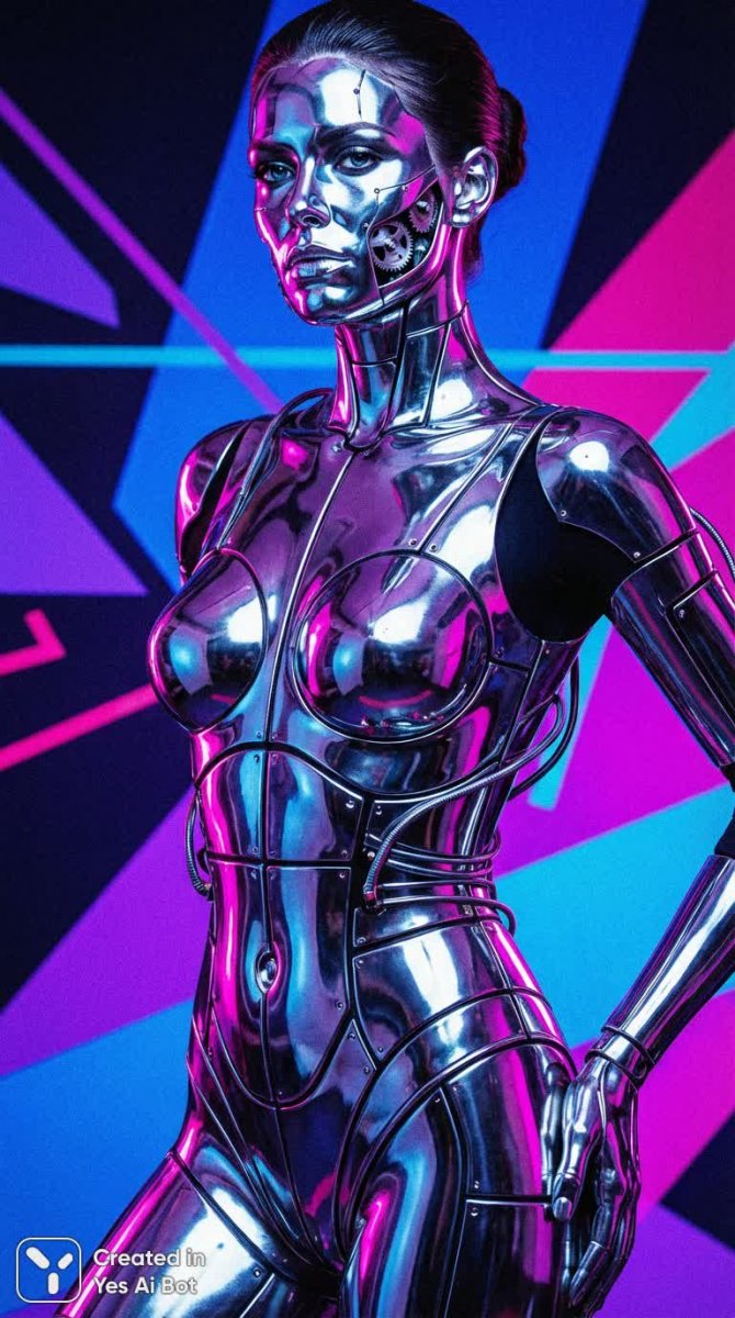 Завораживающий портрет кибернетической красавицы в облегающем хромированном комбинезоне поражает своей детализацией и эстетикой. Идеально подобранный контраст между безупречной внешностью женщины-киборга и ярким графическим фоном создает эффектную визуальную композицию, переносящую зрителя в атмосферу ретро-футуризма 1980-х годов. Каждый элемент изображения пропитан духом эпохи – от геометрических узоров фона до блестящей текстуры костюма, выполненного с невероятной точностью. Взгляд модели притягивает своей загадочностью и силой, а хромированный наряд подчеркивает ее механическую природу, создавая ощущение симбиоза человека и машины. Изображение представляет собой стильное сочетание высоких технологий и ностальгии по эпохе синтезаторной музыки и неоновых огней. Это не просто портрет – это визуальная ода будущему, вдохновленному прошлым, где красота переплетается с кибернетикой в завораживающем танце света и металла. Яркий контраст цветов и четкие линии формируют динамичный образ, который невозможно оставить без внимания. Фотография демонстрирует мастерство исполнения и внимание к деталям, создавая впечатление трехмерности и реалистичности. Киборг-женщина становится символом новой эры – эпохи технологического прогресса и эстетической эволюции