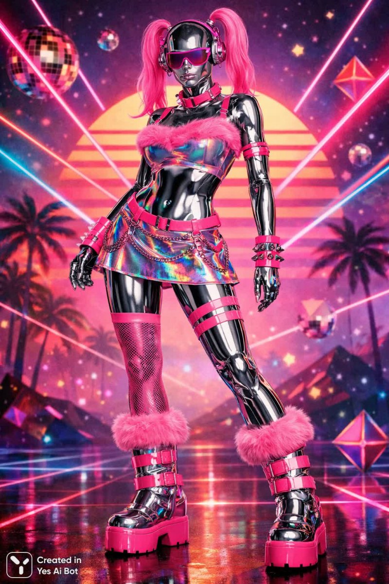 1. full-body portrait of a chrome cyborg woman with pink accessories, in a colorful rave outfit, set against a vibrant background, inspired by retro aesthetics and modern fashion.