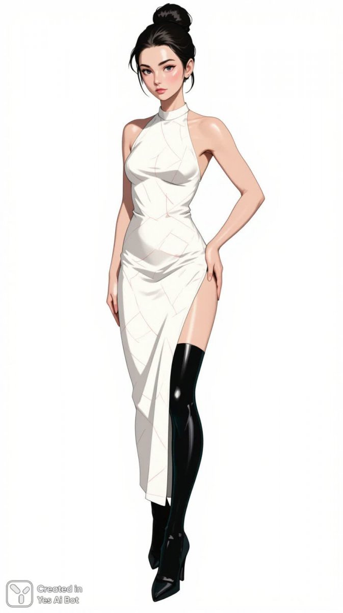 Элегантная современность в каждом элементе: изящная женщина демонстрирует безупречный стиль на фоне минималистичного белого пространства. Белоснежное платье с геометрическим узором и высокой боковой разрезом подчеркивает ее стройную фигуру, а глянцевые черные чулки и высокие каблуки добавляют образу дерзкой уверенности. Идеально гладрая прическа, собранная в элегантный пучок, акцентирует внимание на безупречной фарфоровой коже и подчеркивает современный, утонченный вкус. Фотография выполнена с использованием мягкого студийного освещения и отличается высоким разрешением, что позволяет рассмотреть каждую деталь – от четких линий кроя платья до блеска туфель. Вся композиция создает ощущение изысканной роскоши и безупречной элегантности, являясь ярким примером современной модной съемки. Уверенная поза модели с одной рукой на бедре, а другой у бедра, демонстрирует силу и независимость, дополняя общую концепцию образа. Это воплощение минимализма в моде: лаконичность линий, идеальный крой и безупречная подача создают неповторимую атмосферу стиля и уверенности. Каждый элемент тщательно продуман, чтобы подчеркнуть красоту модели и актуальность трендов. Ощущается легкость и воздушность композиции, несмотря на контраст черных чулок и белого фона. Это больше, чем просто фотография – это история о женственности, силе и безупречном вкусе, рассказанная языком моды