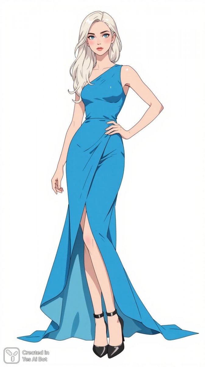 2. tall woman, sleek hair in loose waves, bright blue asymmetrical dress, high heels, expressive features, standing elegantly, hand on hip, BG pure white, digital fashion illustration, high quality.