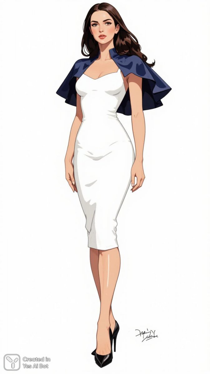 Изысканная элегантность в каждом движении. Белоснежное платье идеально облегает фигуру, подчеркивая женственность и грацию. Драматичные рукава добавляют образу театральности и изысканности, а лаконичные темные туфли на шпильке завершают ансамбль уверенной и стильной женщины. Длинные волосы свободно ниспадают, создавая впечатление легкости и свободы. Композиция снята на уровне глаз, что позволяет зрителю почувствовать близость к модели и ощутить ее внутреннюю силу. Чистый белый фон акцентирует внимание на деталях образа, а яркое освещение придает изображению свежесть и живость. Эта иллюстрация в стиле глянцевого журнала воплощает собой идеал современной женской красоты – сочетание уверенности, элегантности и безупречного вкуса. Взгляд модели полон решимости и внутренней гармонии, что делает эту работу не просто красивым изображением, а настоящим произведением искусства, передающим дух эпохи. Стиль иллюстрации отличается четкостью линий и вниманием к деталям, что создает ощущение реалистичности и правдоподобности. Идеальный выбор для тех, кто ценит классическую красоту и безупречный вкус
