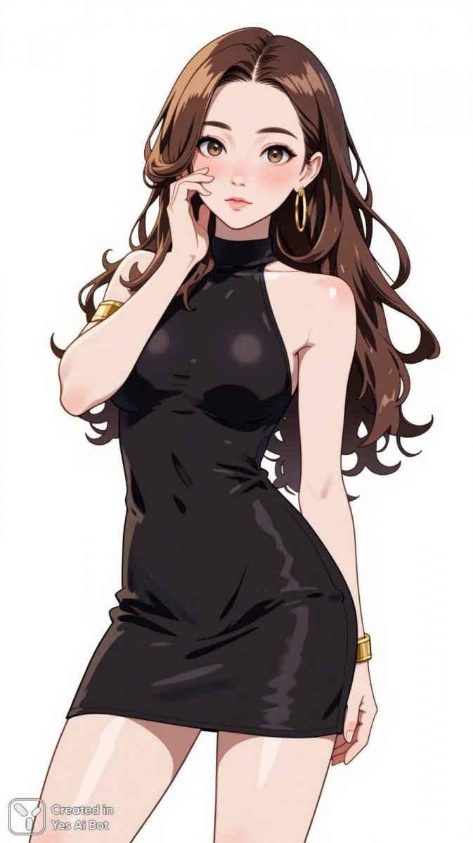 4. ultra-detailed digital image of a young woman, wearing a short black dress, stylish gold accessories, long wavy hair, playful pose with one hand on her cheek, plain white BG, soft ambient lighting.