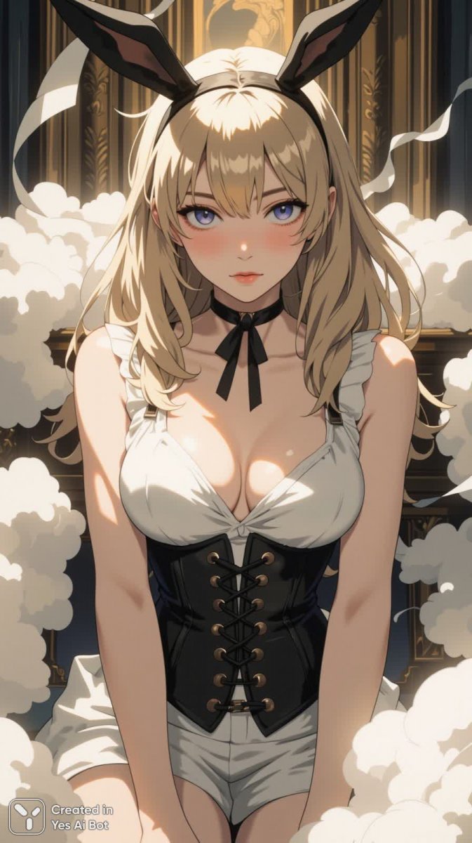3. blonde woman, delicate features, wearing black bunny ears, corset dress, sitting among soft white smoke, luxurious environment, warm light, focus on eyes, black and white photo, professional photography.
