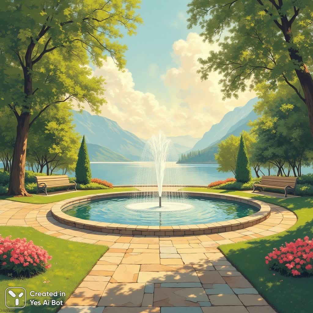 Идиллическая картина, запечатлевшая безмятежную красоту паркового пейзажа, переносит зрителя в мир спокойствия и гармонии. В самом сердце композиции – круглый пруд-зеркало с изящным фонтаном, чьи струи воды взмывают вверх, отражая нежные оттенки неба и окружающего великолепия. Каменная ограда обрамляет водную гладь, создавая ощущение уединенности и защищенности. Передний план украшен изумрудной травой, среди которой рассыпаны яркие клумбы с розовыми цветами, добавляя живости и очарования. Вдали простирается спокойное озеро, тянущееся к горизонту, где таинственные горы скрываются в дымке атмосферной перспективы, создавая ощущение глубины и бесконечности. Пышные зеленые деревья обрамляют сцену по обеим сторонам, словно естественная рама, подчеркивающая красоту увиденного. Удобные деревянные скамейки расположены в стратегических точках парка, приглашая отдохнуть и насладиться окружающим великолепием. Цветовая палитра акцентирует мягкие пастельные оттенки голубого, зеленого, желтого и коричневого, создавая мечтательную и почти неземную атмосферу. Рассеянный и теплый свет указывает на поздний вечер или раннее утро, наполняя картину умиротворением и спокойствием. Стиль произведения напоминает о романтизме и импрессионизме, с акцентом на передачу игры света и атмосферы, вызывая глубокие эмоции и чувство восхищения перед красотой природы