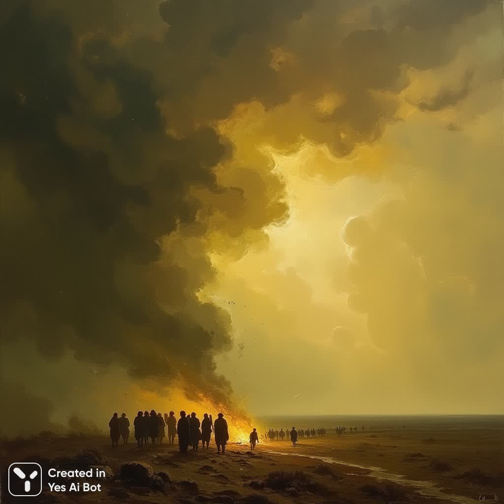 Захватывающий пейзаж, выполненный маслом, пленяет воображение своей масштабностью и драматизмом. Небо занимает почти две трети полотна, представляя собой бурный вихрь темных туч, окрашенных в оттенки глубокого коричневого и серого. Эти мрачные облака контрастируют с яркими вспышками желтого и белого света, пробивающимися сквозь разрывы, создавая неземное сияние, которое будто бы указывает на надежду или предзнаменование перемен. Внизу простирается бескрайняя равнина, выдержанная в приглушенных тонах зеленого и коричневого – земли, из которой вырастает ощущение одиночества и безграничности. На переднем плане группа людей собралась вокруг небольшого костра, чьи языки пламени изображены в различных оттенках оранжевого и красного, словно отчаянно пытаются согреть душу и тело. Вдали, по направлению к горизонту, виднеется еще одна группа, удаляющаяся от огня – возможно, ищущая спасения или новую дорогу. Вся картина пронизана чувством опустошенности и надвигающейся беды, заставляя зрителя задуматься о хрупкости человеческого существования перед лицом стихии. Видимые мазки кисти придают поверхности текстуру и живость, а общая атмосфера наполнена грустью, меланхолией и таинственностью. Низкая линия горизонта подчеркивает величие неба и усиливает драматический эффект. Стиль картины отсылает к романтизму, особенно в использовании света и цвета, напоминая о мастерстве Тернера в создании атмосферных эффектов. Выразительный стиль живописи с выраженной текстурой создает ощущение непосредственности и эмоциональной глубины, погружая зрителя в мир тревоги и размышлений о вечном
