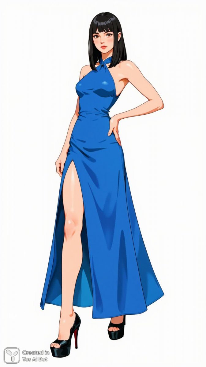 young woman with straight dark hair, halter neck blue dress, high side slit, black platform pumps, elegant pose, confident look, minimal accessories, bright lighting, fashion illustration, digital painting, highly detailed.