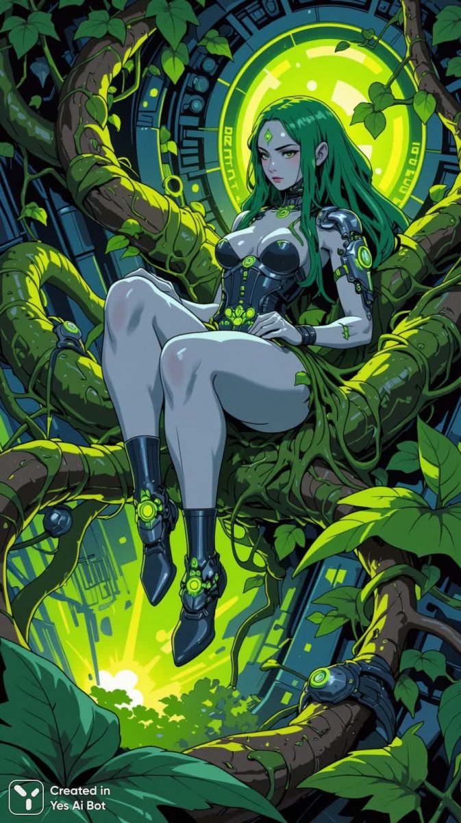 1. biomechanical Gaia entwined with vines, dramatic low angle, serene reclining pose, iridescent silver leaf skin, glowing emerald eyes, mossy green hair, cascading botanical dreadlocks, ethereal slender build, armored bark corset and ivy robe, (overgrown techno-forest:1.1), (centerlit surrounded by circuit trees:1.2), (y2k-futurism:1.3), (bioluminescent glow:1.5), (4:5 vertical:1.3), (digital acrylic:1.4), (by James Jean:1.2), 8k ultra HQ