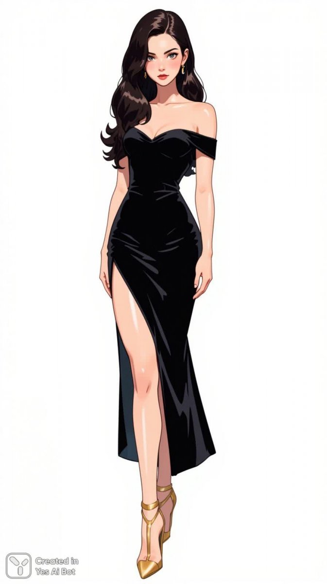 1. tall girl with elegant posture, long dark hair in waves, fitted black off-shoulder dress with high slit, strappy gold heels, striking expression, standing with one leg forward, white BG, fashion illustration, soft lighting.