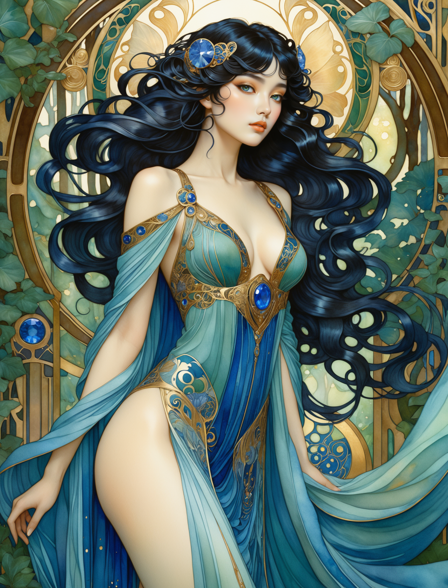 2. A biomechanical gaia, three-quarter view, graceful pose, textured bronze skin, sapphire eyes, cascading black hair, wavy hairstyle, toned physique, flowing robe, (lush forest:1.3), (mythical realm:1.2), (art nouveau:1.4), (soft glow:1.2), (watercolor:1.1), (illustration:1.5), (by Gustav Klimt:1.1), 32K