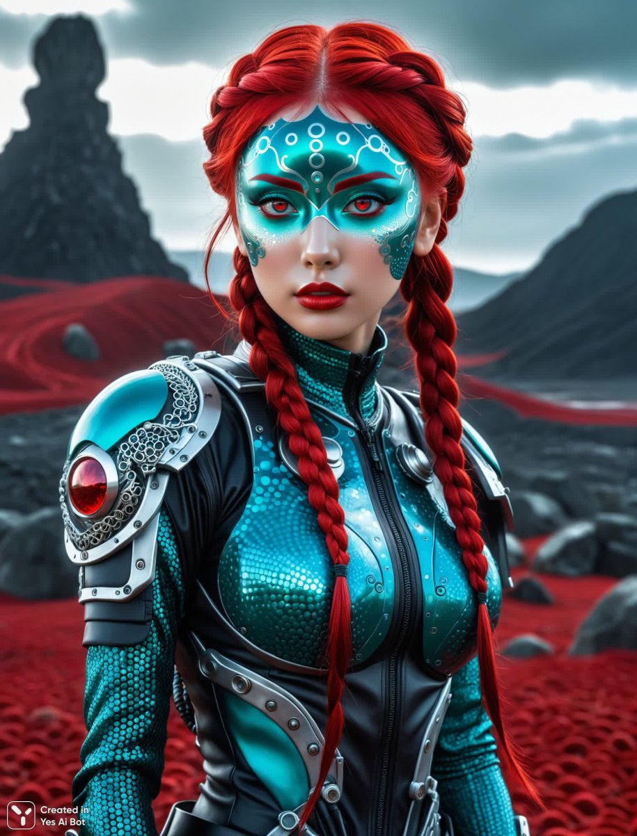 5. A biomechanical gaia, frontal perspective, powerful pose, radiant teal skin, ruby eyes, braided red hair, long braid, sturdy build, tactical outfit, (dystopian landscape:1.3), (science fiction:1.2), (hyperrealism:1.4), (moody lighting:1.2), (mixed media:1.1), (fine art:1.5), (by Yayoi Kusama:1.1), 32K