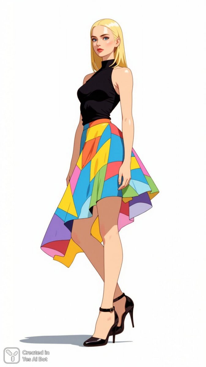 Элегантная и уверенная в себе женщина предстает перед нами на стильной цифровой иллюстрации. Ее образ подчеркнут дерзким черным халтером, идеально сочетающимся с асимметричной юбкой, играющей яркими красками. Высокие сандалии на каблуке добавляют нотку изысканности и завершают этот современный ансамбль. Прямые волосы аккуратно уложены, обрамляя лицо с четкими чертами, которое выражает решительность и харизму. Поза модели смелая и динамичная, привлекающая внимание и передающая ощущение силы и независимости. Использование яркого заполняющего света создает насыщенные цвета и подчеркивает детали изображения, усиливая визуальный эффект. Белый фон позволяет выделить фигуру женщины и акцентировать внимание на ее стильном образе, создавая чистый и лаконичный эстетический вид. Эта иллюстрация – воплощение современной моды и уверенности в себе, сочетающее в себе смелость, элегантность и яркий художественный стиль. Она демонстрирует гармоничное сочетание цветов, текстур и форм, создавая запоминающийся визуальный образ. Это современное искусство, вдохновленное модой, которое передает ощущение динамики и энергии. Иллюстрация выполнена с использованием цифровых технологий, что позволяет добиться высокой детализации и точности в передаче мельчайших нюансов стиля