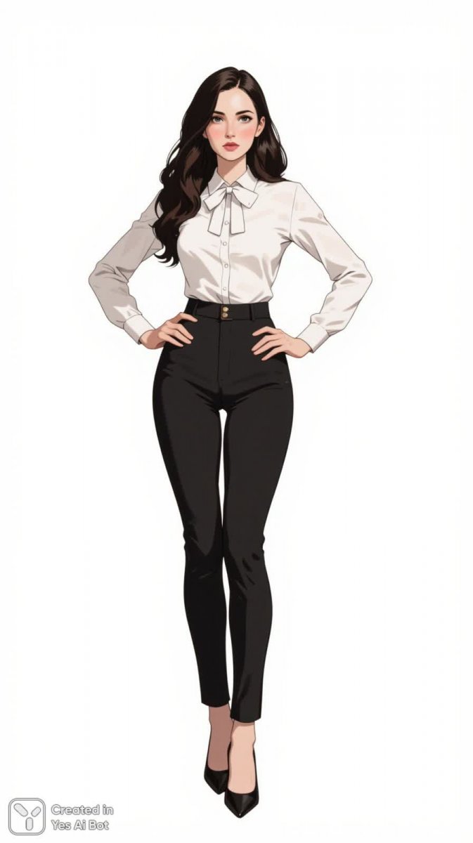 tall woman with long legs, dark hair in loose waves, white blouse with bow tie, fitted black trousers, pointed toe pumps, hands on hips, confident stance, BG is white, fashion illustration, soft studio lighting, eye level.