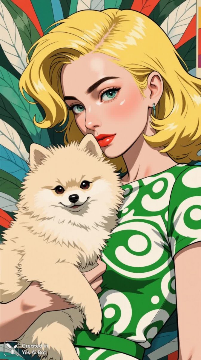 4. woman with unusual retro blonde hairstyle, green and white patterned dress, bright lips, holding fluffy pomeranian dog, art deco background with dynamic colors, poised pose, soft lighting, high fashion art style, close-up shot.
