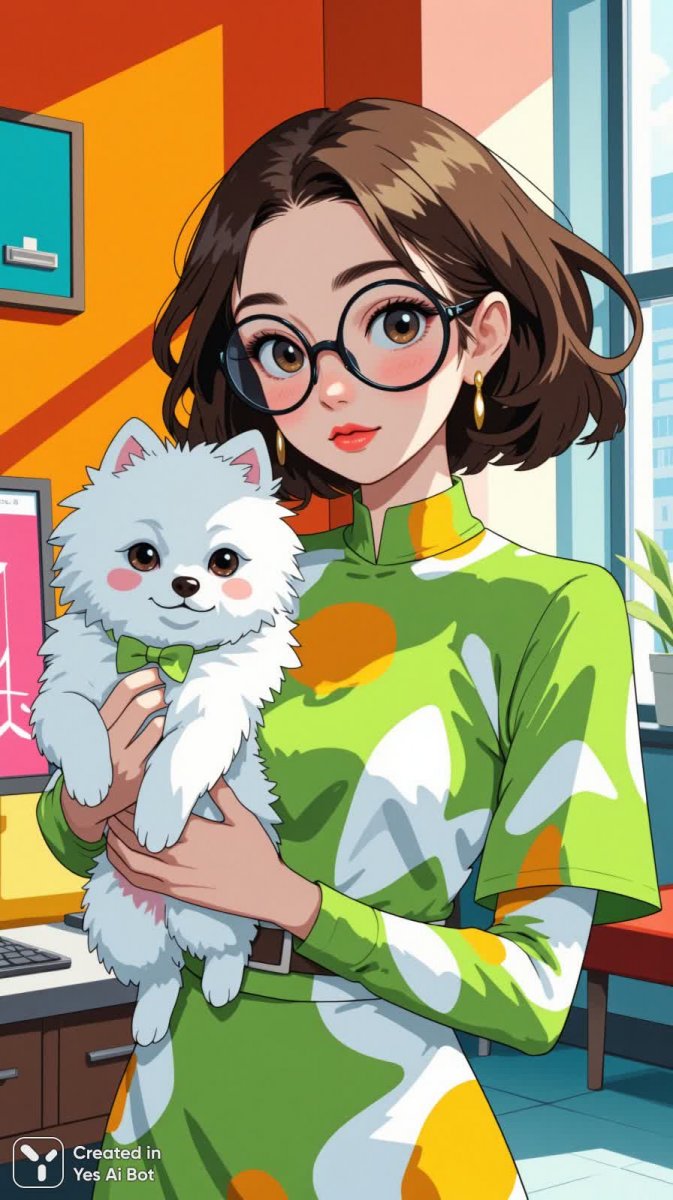 1. girl with big expressive eyes, oversized black round glasses, bright red lipstick, holding fluffy white pomeranian dog with matching bow, green dress with large abstract patterns, vibrant modern interior, soft diffused lighting, creative fashion portrait style.