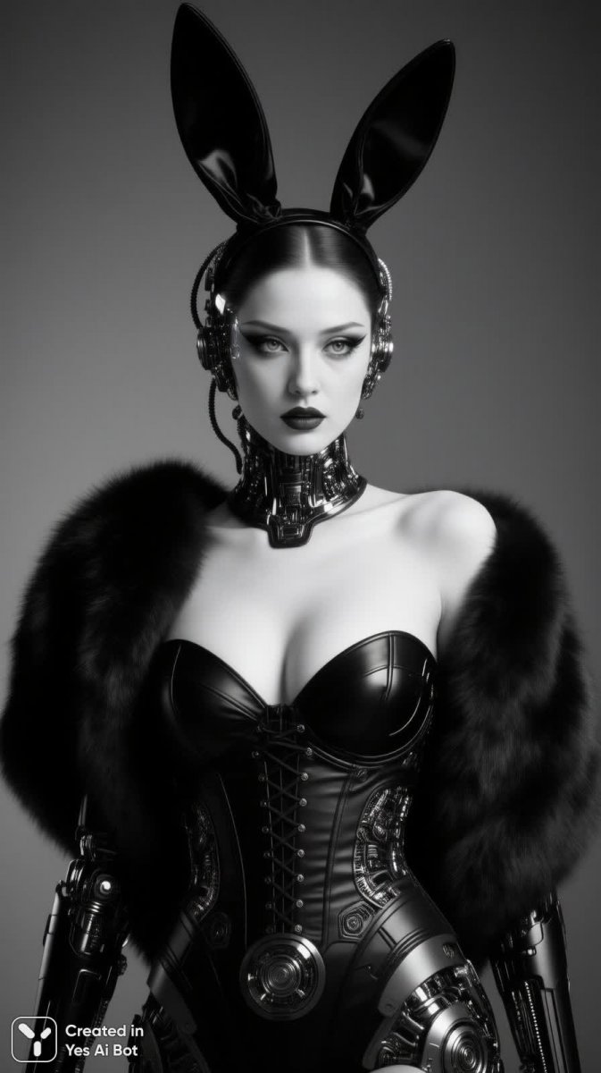 Изображение представляет собой черно-белый портрет европейской женщины в стилизованном образе, вдохновленном работами Ги Сорраямы. Центральный элемент композиции – лицо женщины с выразительным макияжем и пронзительным взглядом. Её тело облачено в сложный корсетный наряд, подчеркивающий фигуру, а плечи украшает меховой боа. Акцент сделан на деталях: эффектные заячьи ушки добавляют игривости, а глубокий темный фон выделяет свет и текстуры костюма и лица. Иллюстрация создана нейросетью Qwen Images и сочетает в себе элементы моды, искусства и фотографии, передавая атмосферу загадочности, соблазна и утонченной элегантности, демонстрируя тщательно продуманную сцену с вниманием к каждой детали для создания неповторимого визуального эффекта. Вдохновение черпалось из биомеханического и футуристического стилей, создавая образ, одновременно роскошный и загадочный.