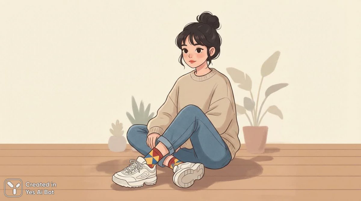 Уютная сцена из мира мультфильмов: молодая девушка неторопливо отдыхает, скрестив ноги в элегантной позе. Ее образ подчеркивает сочетание простоты и яркости – белые кроссовки гармонично дополнены забавными носками с красочным узором, создавая непринужденный и стильный акцент. Мягкий кремовый фон создает ощущение спокойствия и нежности, позволяя полностью сосредоточиться на деталях композиции. Использование мягких теней добавляет глубины и объема, придавая изображению реалистичность, несмотря на его мультяшную природу. Картина выполнена в современном стиле с продуманной композицией, привлекающей внимание к деталям и создающей общее впечатление легкости и позитива. Это идеальное сочетание небрежной расслабленности и модной эстетики, воплощенное в ярком и запоминающемся визуальном образе. Стильный минимализм фона позволяет выделить ключевой элемент – девушку с ее необычными носками, делая акцент на индивидуальность и самовыражение. Изображение излучает атмосферу комфорта и беззаботности, идеально подходя для использования в различных дизайнерских проектах, требующих добавления позитивного и молодежного настроения. Этот образ – это маленькая история о стиле и уюте, рассказанная с помощью ярких красок и плавных линий