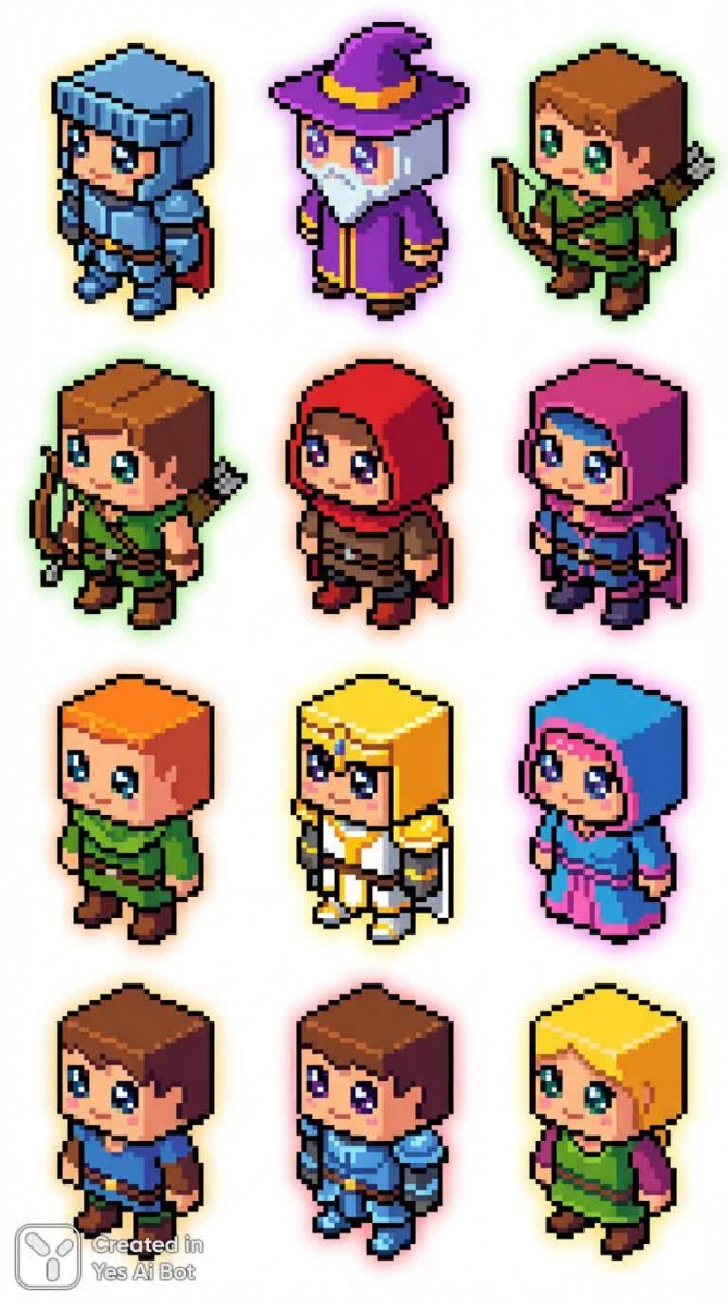 set of pixel art heroes, expressive big eyes, various bright costumes, fantasy outfits, square heads, isometric view, game style, cozy digital atmosphere, symmetrically arranged, top view, lively colors, simple anatomy, white bg