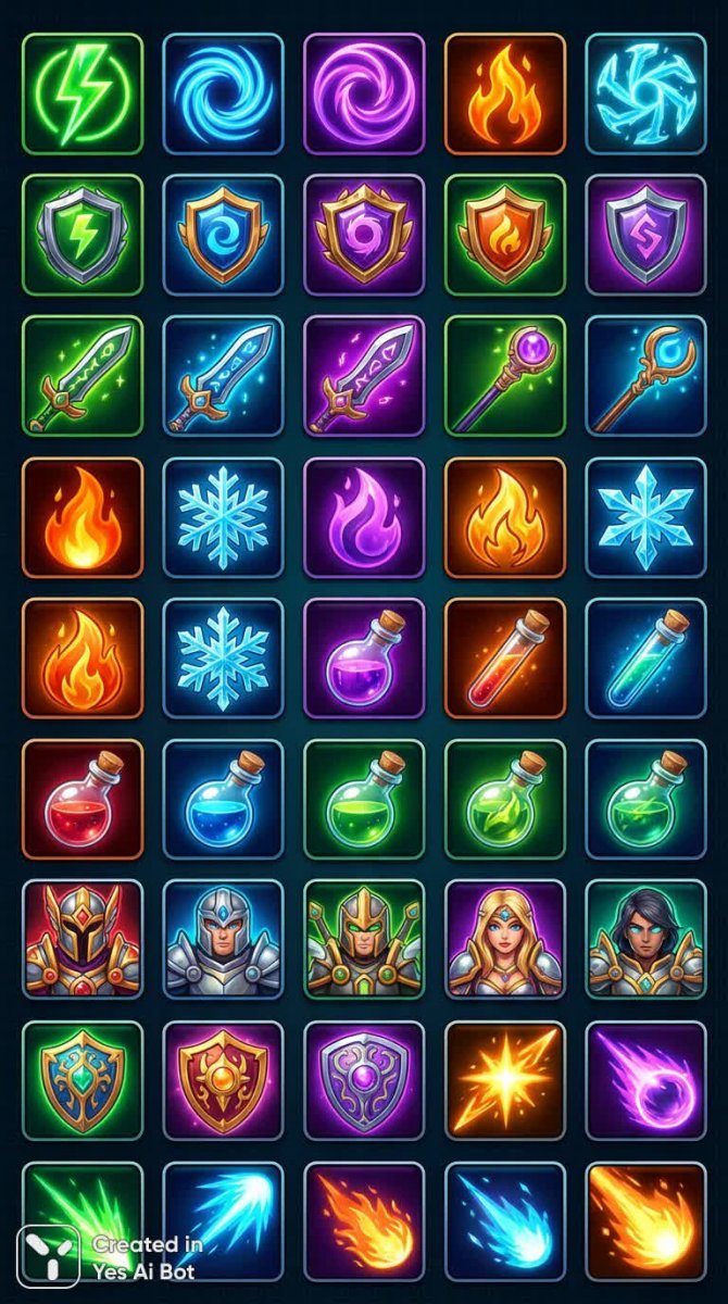 Яркий набор из сорока неоновых иконок заклинаний, созданных в стиле фэнтези RPG. В коллекции представлены стилизованные значки для игр, изображения зачарованного оружия с высокой детализацией, символы огня и льда, мерцающие зелья. Идеально подойдут для создания аватаров героев, магических щитов и других элементов пользовательского интерфейса в современных играх. Каждый символ выполнен в квадратном формате с использованием ярких неоновых цветов на темном фоне, подчеркнутых глянцевыми эффектами. Дизайн сочетает в себе насыщенность цифрового искусства и современный игровой стиль, демонстрируя мощь суперспособностей и загадочность магического мира. Иконки идеально подойдут для создания атмосферы волшебства и приключений, обеспечивая визуально привлекательный и узнаваемый опыт для игроков. Особое внимание уделено деталям, что делает эти элементы незаменимыми для разработки игр в жанре фэнтези. Использование неоновых цветов добавляет динамики и энергии, а темный фон акцентирует внимание на ярких символах, создавая эффект свечения. Эти иконки станут отличным дополнением к любому игровому проекту, требующему визуально насыщенных и запоминающихся элементов дизайна