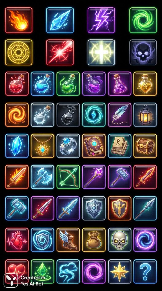 nanobanana Магические иконки: Фэнтези, заклинания и артефакты для игр. Картинка из нейросети Nano Banana