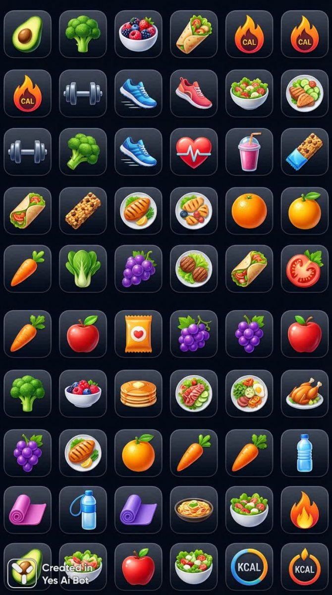 set of 40 colorful app icons, food items, digital art, vegetables, fruits, snacks, meals, calorie symbols, square format, modern glossy design, detailed elements, vibrant colors, dark bg, high detail level, each icon separate, healthy food, fitness, BG black