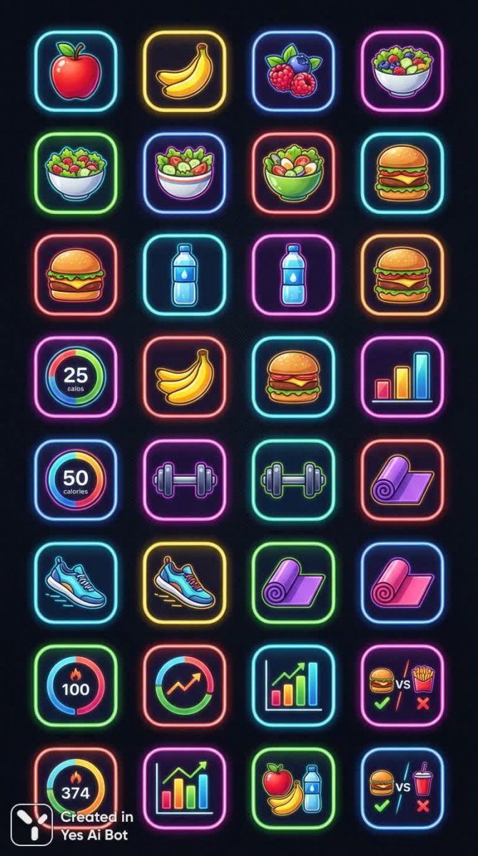 nanobanana Иконки для фитнеса: здоровое питание и полезные перекусы в ярком стиле. Генерация из нейронной сети NanoBanana
