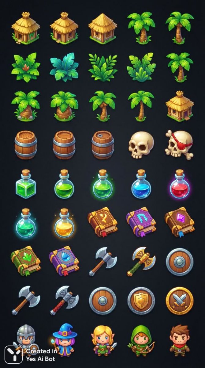 Яркий набор из сорока веб-иконок в мультяшном стиле, посвященный тематике приключений и экзотики. Иллюстрации выполнены с акцентом на тропические хижины, пышную растительность джунглей и элементы фэнтези. Встречаются бочки, черепа, колбы с зельями, волшебные книги, боевые топоры, деревянные щиты и стилизованные персонажи, погружающие в атмосферу приключений и магии. Изображения представлены под углом изометрии, что добавляет динамики и глубины. Насыщенная цветовая палитра с использованием ярких оттенков контрастирует с темным фоном, подчеркивая детали и создавая эффект глянцевой поверхности. Этот высококачественный набор идеально подходит для использования в качестве игровых активов или элементов дизайна веб-сайтов, посвященных приключениям, фэнтези и путешествиям. Иконки выполнены с любовью к деталям, обеспечивая визуальную привлекательность и узнаваемость. Они легко интегрируются в различные проекты, придавая им уникальный и запоминающийся вид. Набор станет отличным выбором для разработчиков игр, веб-дизайнеров и всех, кто ценит качественный графический контент с яркой индивидуальностью и креативным подходом