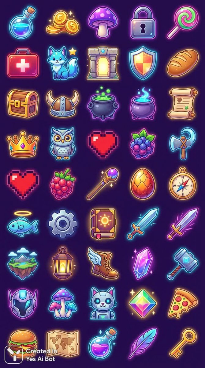 nanobanana Стильные иконки для сайта: фэнтези, еда и яркие неоновые акценты. Генерация из нейронной сети NanoBanana