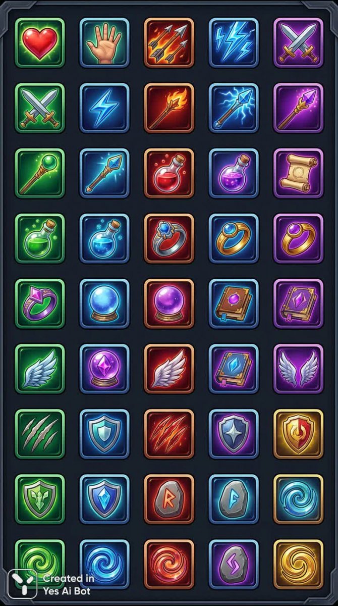 set of 40 icons for site, magical ability badges, each icon separate, RPG symbols, heart, hand, arrows, fire, lightning, swords, magical items, potions, artifacts, vibrant colors, glossy digital style, sharp detail, dark background, modern game UI, high resolution.
