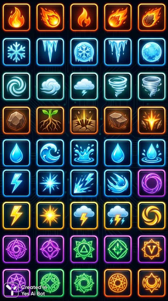 nanobanana Яркие магические иконки для видеоигры: стихии и заклинания. Изображение из нейросети Nano-Banana