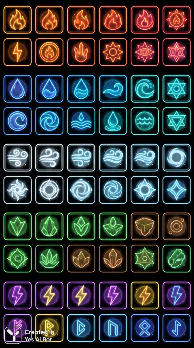 set of fantasy spell icons, 40 square badges, each with colorful magic element, fire, water, air, earth, lightning, arcane symbols, glowing line art, soft shadows, digital illustration, RPG style, vibrant neon colors, modern UI, black BG, detailed effects.