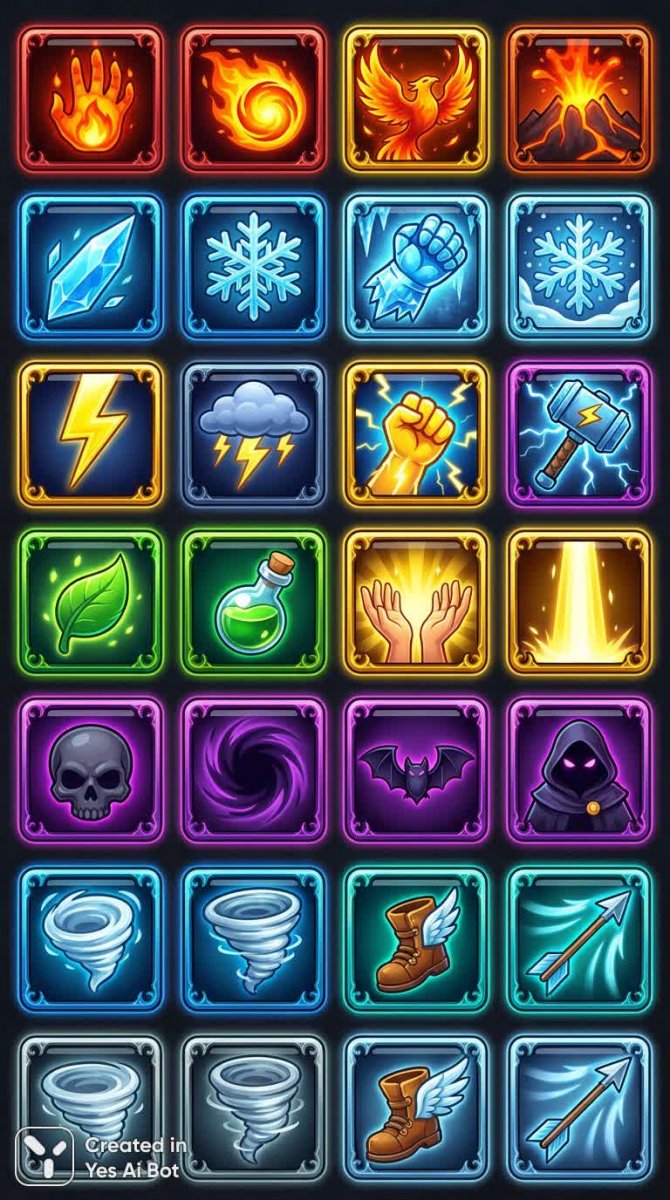 Набор стилизованных иконок магических умений для видеоигры, представляющий собой 40 различных элементов сил природы и магии. Каждый квадрат отражает уникальную способность: могущественный огонь, пронизывающий холод, громоподобный гром, исцеляющее сияние, окутывающая тень, стремительные порывы ветра и ослепительное свечение волшебства. Яркие насыщенные цвета выгодно контрастируют с темным фоном, создавая эффект глубокого погружения в игровой мир. Иконки выполнены в глянцевой цифровой графике в стилизованном мультяшном стиле, что добавляет им игривости и динамизма. Четко очерченные границы каждого значка обеспечивают их отличную читаемость и визуальное отделение друг от друга. Высокое качество исполнения гарантирует превосходное отображение на различных экранах и платформах, делая эти иконки идеальным выбором для разработки увлекательной и захватывающей видеоигры с акцентом на магические способности и элементы фэнтези. Дизайн разработан с учетом современных тенденций в игровой графике, обеспечивая визуальную привлекательность и функциональность каждого элемента. Этот набор станет ценным дополнением к любому проекту, требующему качественного и запоминающегося визуального представления магических умений