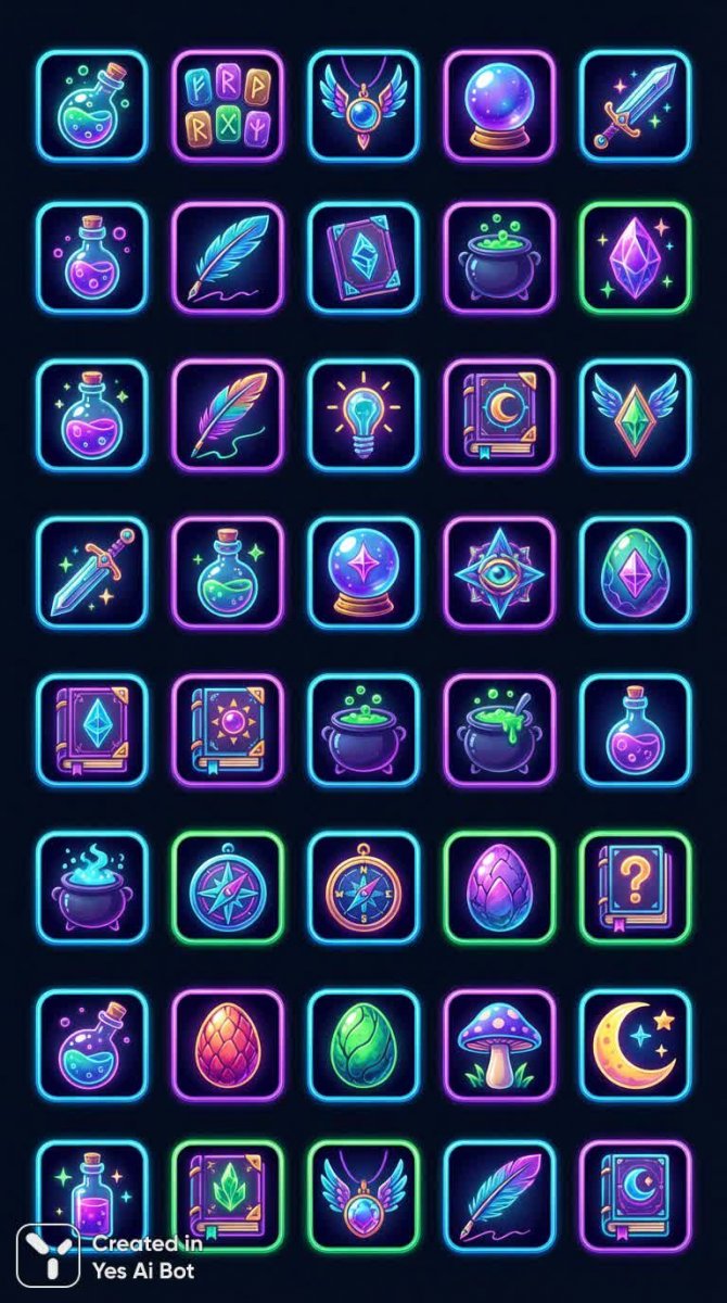 set of unique fantasy-themed icons for app, 40 square designs, magical elements, potions, charms, vivid neon colors, game interface style, stylish borders, high detail level, dark backdrop, sharp outlines, playful design, digital art.