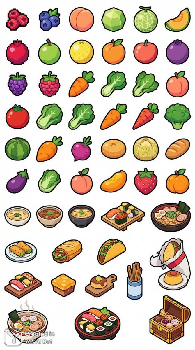 Набор из сорока уникальных блюд, ярких фруктов и насыщенных овощей, представленный в детальных иллюстрациях. Это красочное собрание различных кулинарных направлений мира, выполненное в цифровой графике с высоким качеством исполнения. Изометрический вид позволяет рассмотреть каждую деталь, а игривый стиль придает изображению легкость и привлекательность. Четкие контуры и яркая цветовая палитра делают акцент на каждом продукте, создавая аппетитный визуальный эффект. Этот набор идеально подходит для использования в качестве игровых ресурсов (assets) в RPG-играх или в качестве фона, благодаря чистому белому цвету, который не отвлекает внимание от основных элементов композиции. Каждый элемент тщательно проработан и готов к использованию в различных проектах, где требуется визуально привлекательное и детализированное представление пищи. Откройте для себя мир вкуса и креатива с этим уникальным набором иллюстраций!