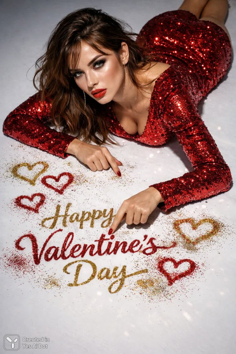 4. photorealistic, young woman lying on clean white floor, dressed in shimmering red sequin dress, drawing hearts in glitter with her fingers, intense expression, glossy makeup and tousled hair, well-lit with spotlight emphasizing glitter details, dynamic composition, shooting from above, fujifilm gfx 50s, 45mm lens, f/2.8, "happy valentine's day".