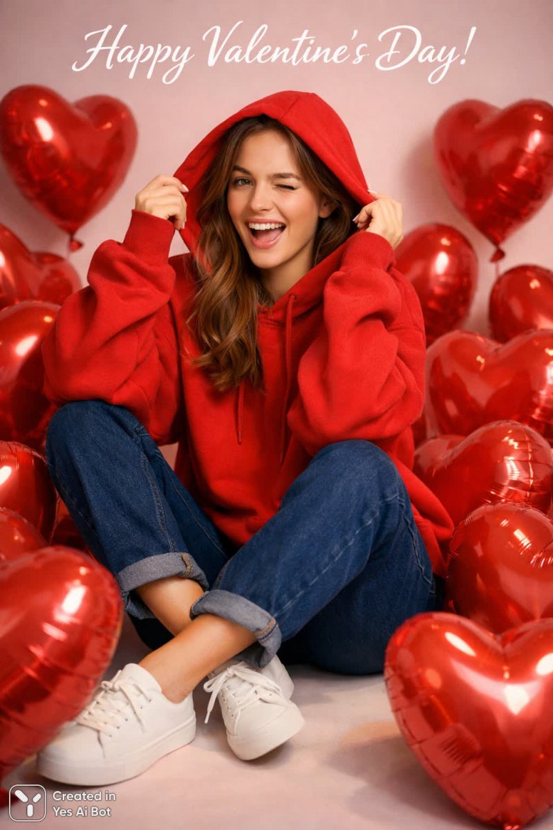 1. ultra realistic, high detail, young woman wearing oversized red sweater, surrounded by heart-shaped balloons, deep blue jeans, minimalistic sneakers, warm soft lighting casting gentle shadows, playful expression, vibrant color contrast with soft pastel BG, editorial photography style, eye-level angle, canon 5d mark iv, 50mm lens, f/1.8, "happy valentine's day".