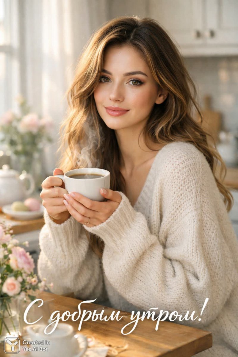 1. photorealistic, young woman with long wavy hair, wearing cozy oversized sweater, sitting in a bright kitchen, holding a steaming cup of coffee, light streaming in through the window, soft pastel color palette, calm morning vibe, slight smile, delicate floral decorations on the table, sunlight illuminating her face, "С добрым утром!", camera: canon eos r5, lens: 50mm f/1.2, settings: f/1.8, 1/125s, iso 100.