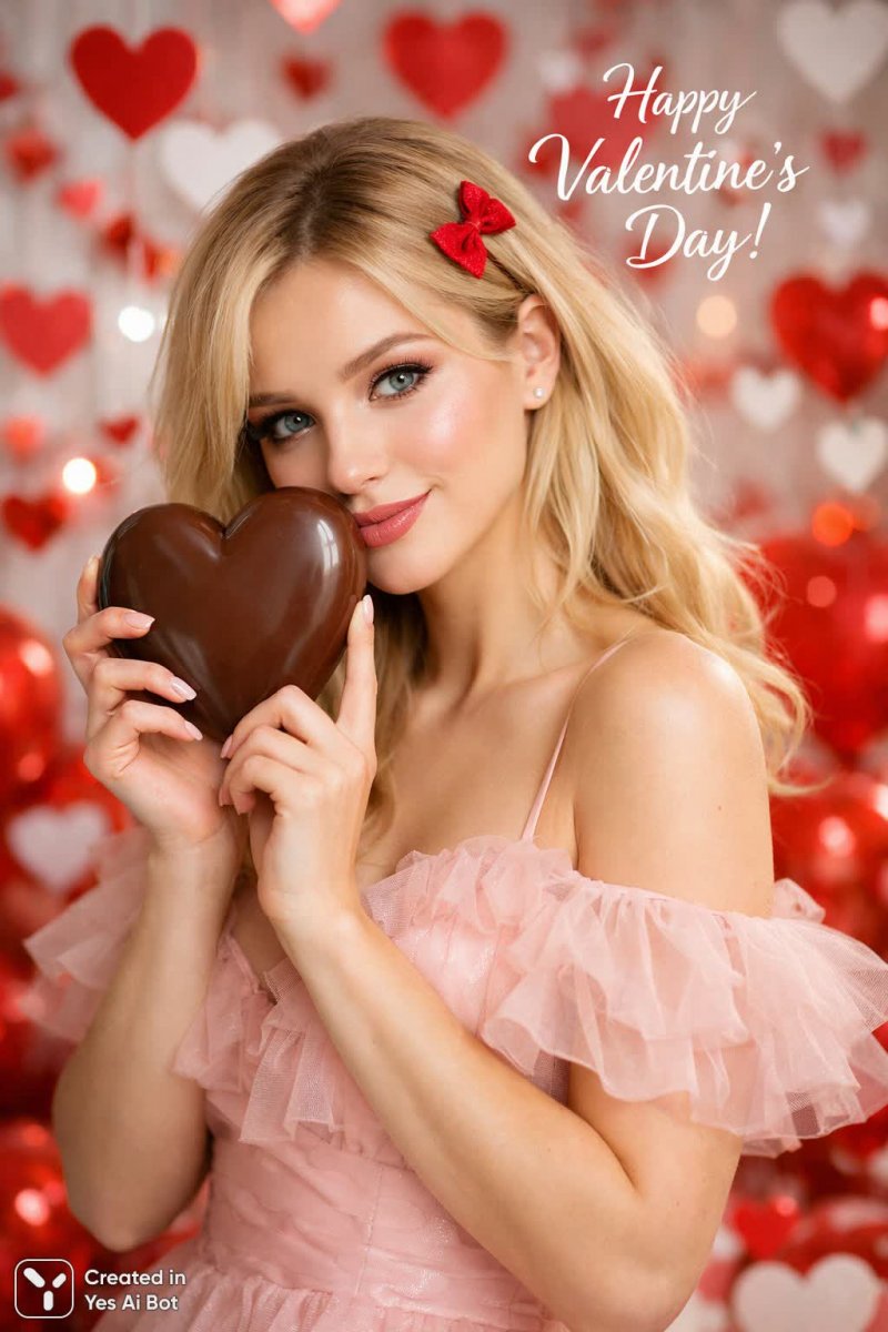high detail, beautiful young woman with short blonde hair, wearing light pink dress, playfully holding a large heart-shaped chocolate, vibrant red accents around, bright studio filled with soft heart decorations, gentle expression, soft diffused lighting, editorial photography style, shallow depth of field, camera: nikon z7, lens: nikkor z 35mm f/1.8 s, settings: iso 200, f/2.0, 1/100 sec, "happy valentine’s day".