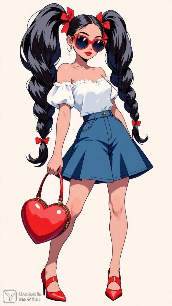 4. girl with two braids adorned with red ribbons, large sunglasses and red lipstick, posing with a heart handbag, playful pop art illustration, plain background.